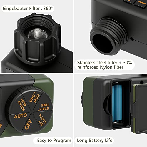 - Easy to Use: The automatic watering timer is equipped with three buttons, a rotary dial and an LCD screen, making it easier for you to set and check the watering schedule than with the button-only version. It has a 360? rotatable water inlet fitting, which you can thread to accommodate any standard 3/4 " or 1/2 " garden hose