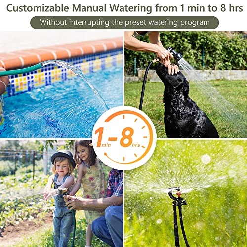 - Manual Watering Mode: Hose timer enables you to manually water from 1 minute to 8 hours without interrupting your current watering program. It’s ideal for use in gardens, flowerbeds, lawns, patios, greenhouses, fountains, farms and more