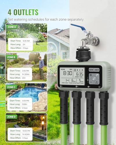 - 4 Independent Irrigation Zones: The sprinkler timer boasts four independent outlets, allowing you to set watering times, frequency, and duration for different areas such as courtyards, gardens, and lawns, easily achieving smart and efficient plant care